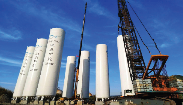 近日,浙江省工業設備安裝集團有限公司第五分公司承建的江蘇泰興新浦化學40萬m3輕烴倉儲項目安裝工程7臺液態甲烷罐吊裝成功。