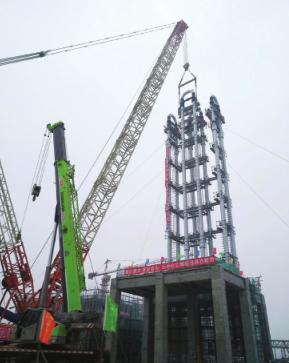 近 日 , 浙江省工業(yè)設(shè)備安裝集團(tuán)有限公司第三分公司承建的中化泉州石化40萬噸/年聚乙烯項(xiàng)目大件吊裝成功。該項(xiàng)目位于福建省泉州市惠安縣泉惠石化工業(yè)區(qū),工程建設(shè)范圍包括設(shè)備、鋼結(jié)構(gòu)、管道、電氣、儀表、電信、暖通、消防、給排水等。此次吊裝的第一套環(huán)管反應(yīng)器單片設(shè)備高57米、寬7.8米,共4個(gè),總體重量480噸。項(xiàng)目部采用雙機(jī)抬吊法,以800噸履帶吊為主吊,260噸履帶吊溜尾,將設(shè)備吊至13米高的平臺(tái)上,順利吊裝就位。