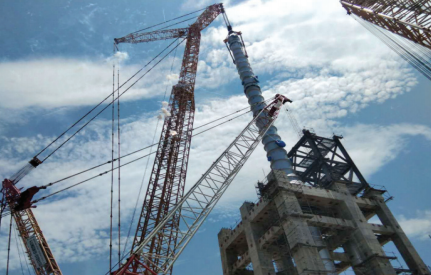 近日,浙江省工業設備安裝集團有限公司第三分公司承建的浙江 石油化工有限公司4000萬t/a煉化一體化項目二期工程3#380萬t/a連 續重整裝置三合一反應器順利吊裝。 據悉,該裝置為單套重整裝置,三合一反應器高達96m、重量約 613t,是整個項目最大、最重、最核心的設備。項目部采用2800t履帶 吊為主吊,700t履帶吊為輔吊,最終順利完成吊裝任務,也標志著該項 目正式進入安裝工程施工高峰階段。