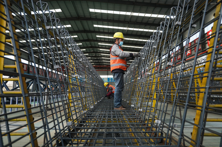施工工地有“大型搭積木現場”,背后當然有一座制作“積木”的“大型生產工廠”。走進中建安裝312國道改造項目預制基地,機聲隆隆,焊花四濺。工人們正有條不紊地進行流水線作業。橋梁預制構件從原材料到成品,經過層層嚴格工序后,完美“出道”。