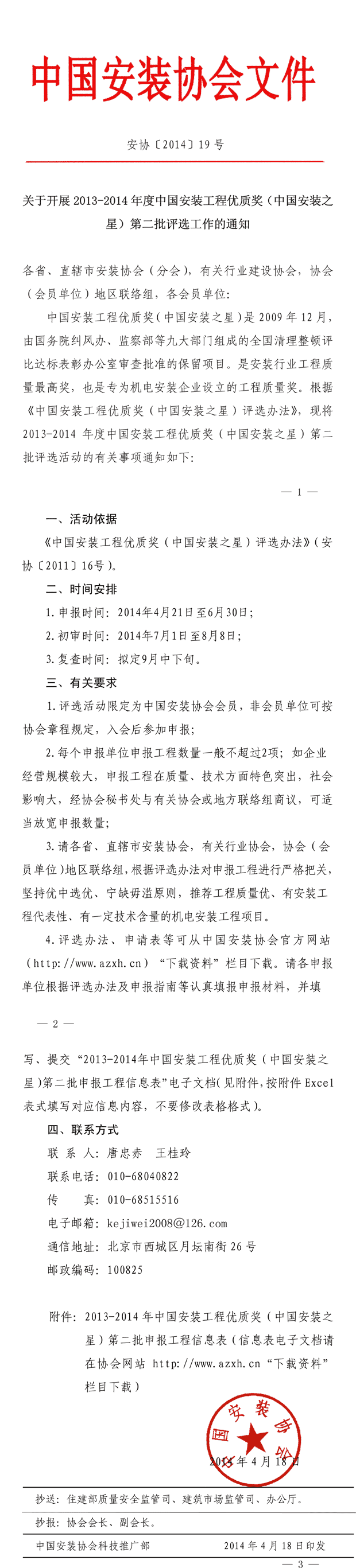 關于開展2013-2014年度中國安裝工程優質獎(中國安裝之星)第二批評選工作的通知