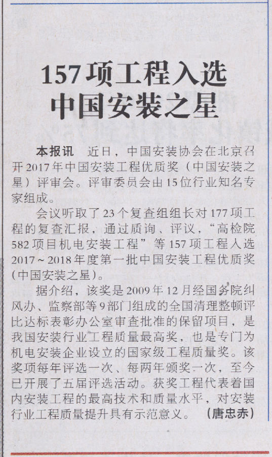 《中國建設報》報道“中國安裝之星”評選結果