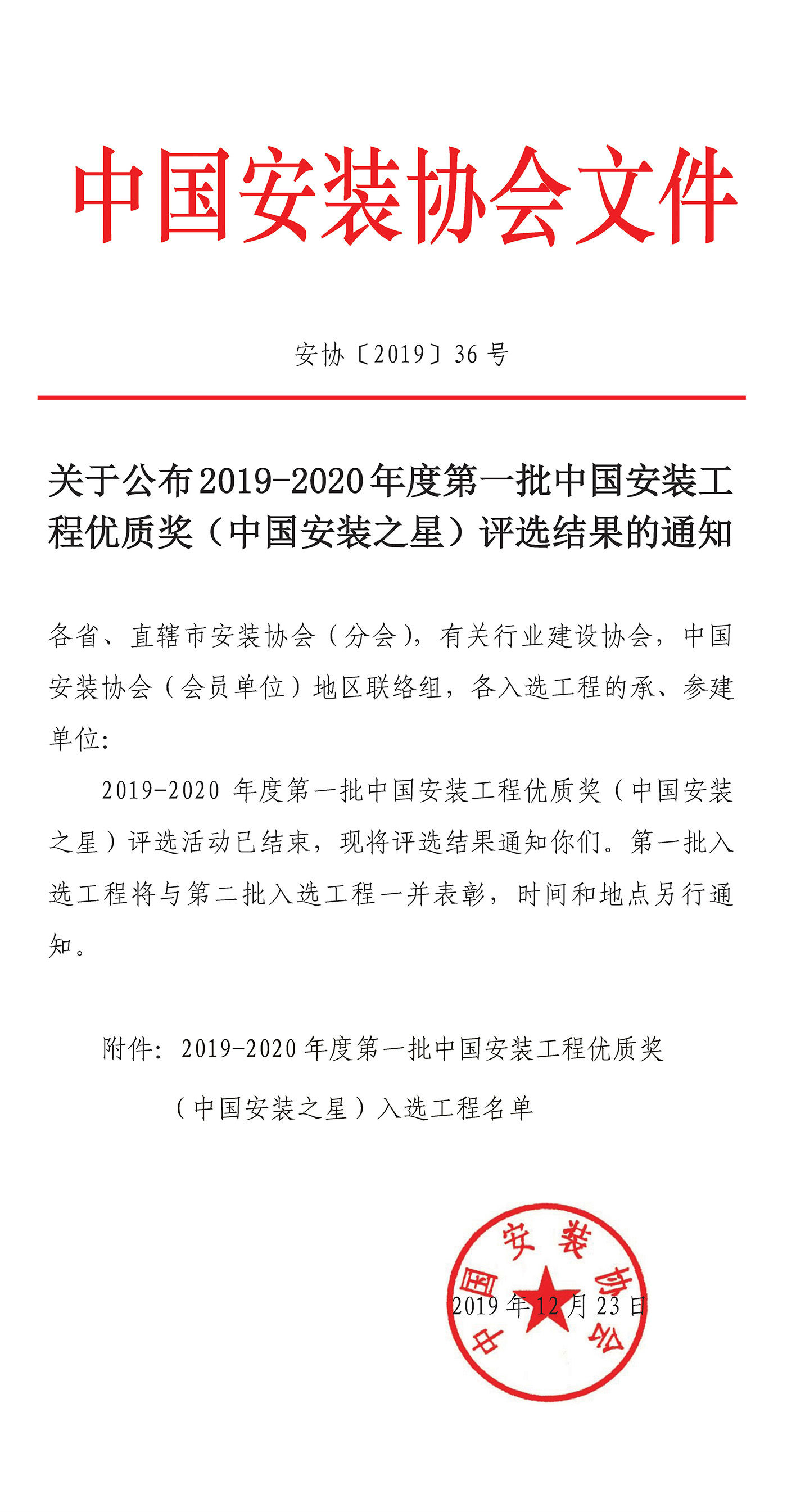 關于公布2019-2020年度第一批中國安裝工程優質獎(中國安裝之星)評選結果的通知