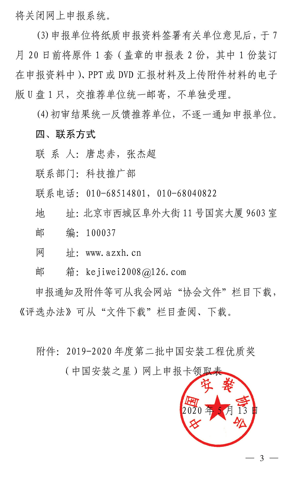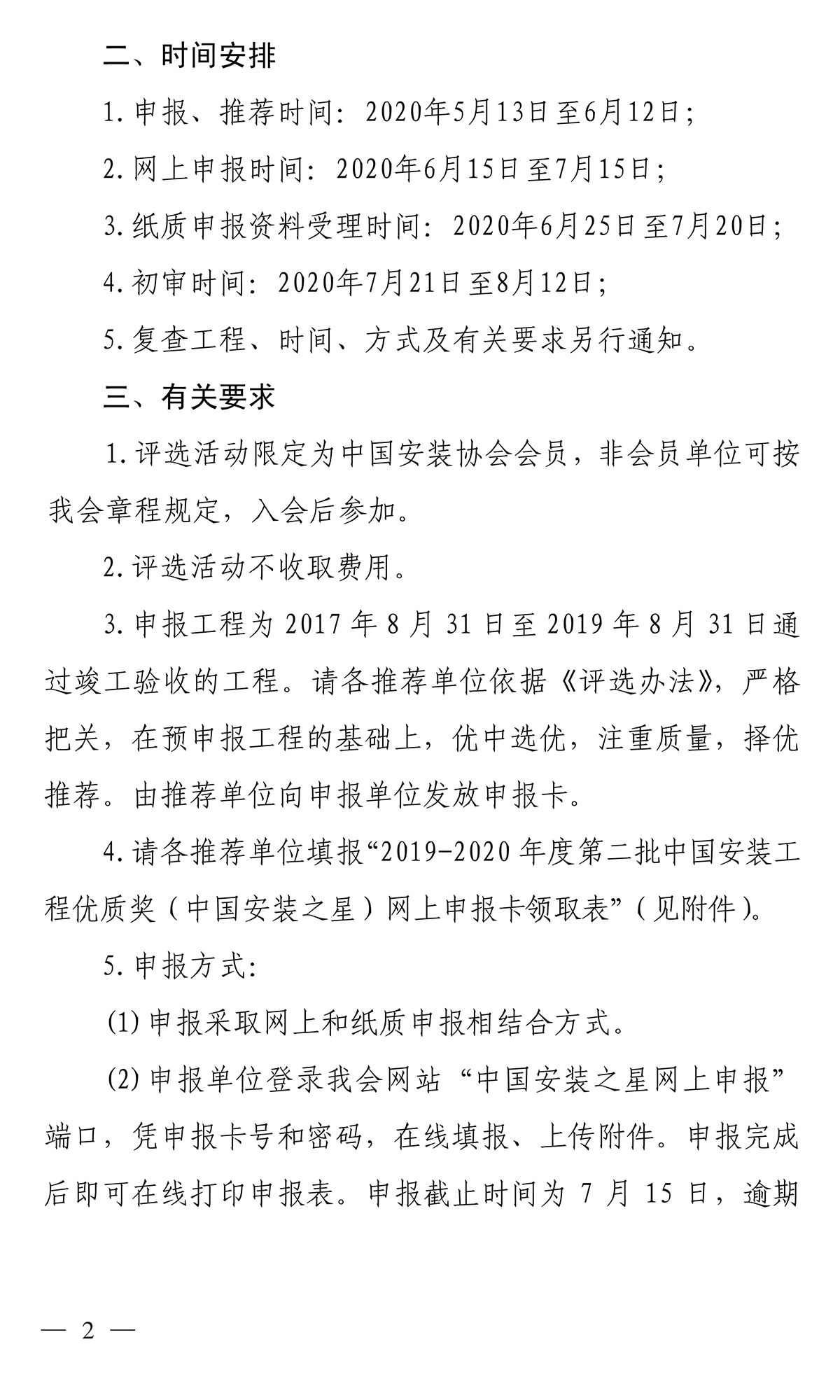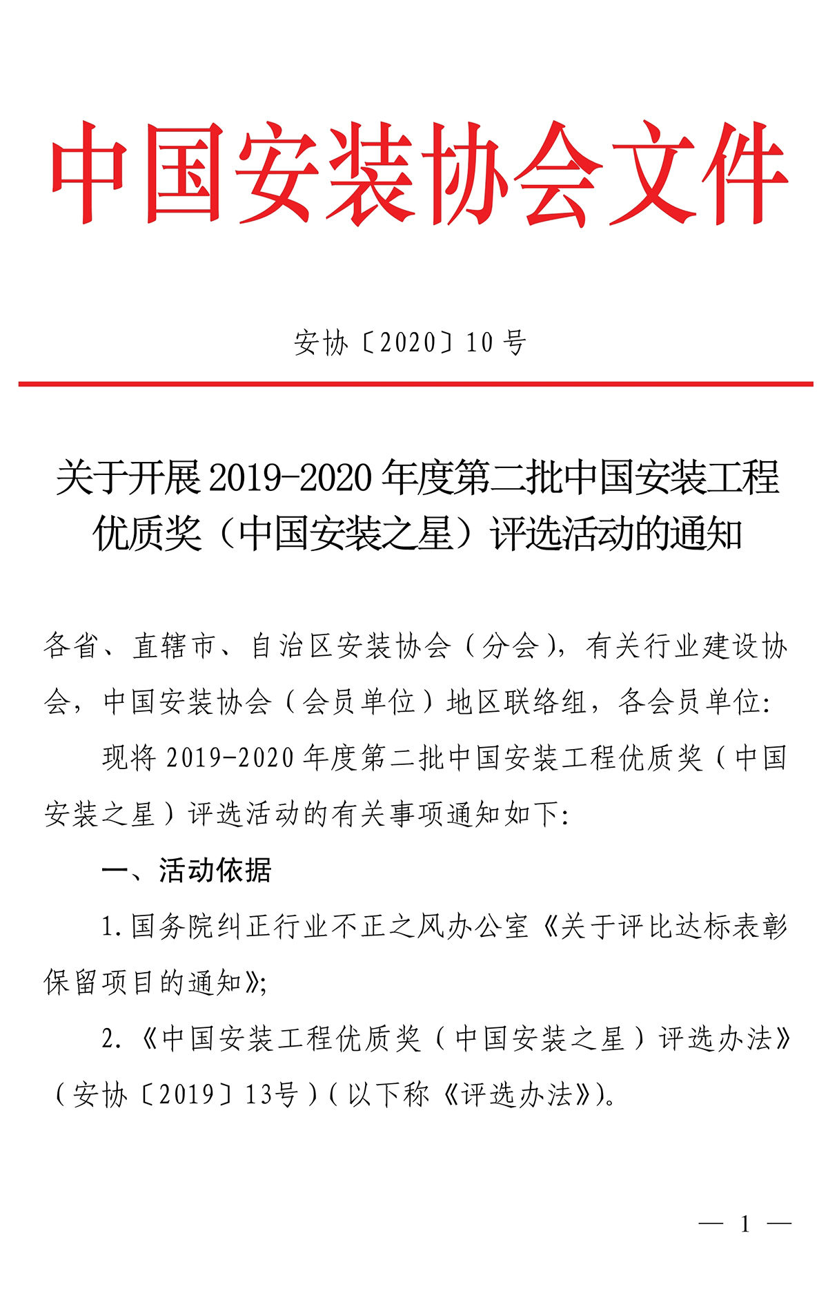 關于開展 2019-2020 年度第二批中國安裝工程優質獎(中國安裝之星) 評選活動的通知