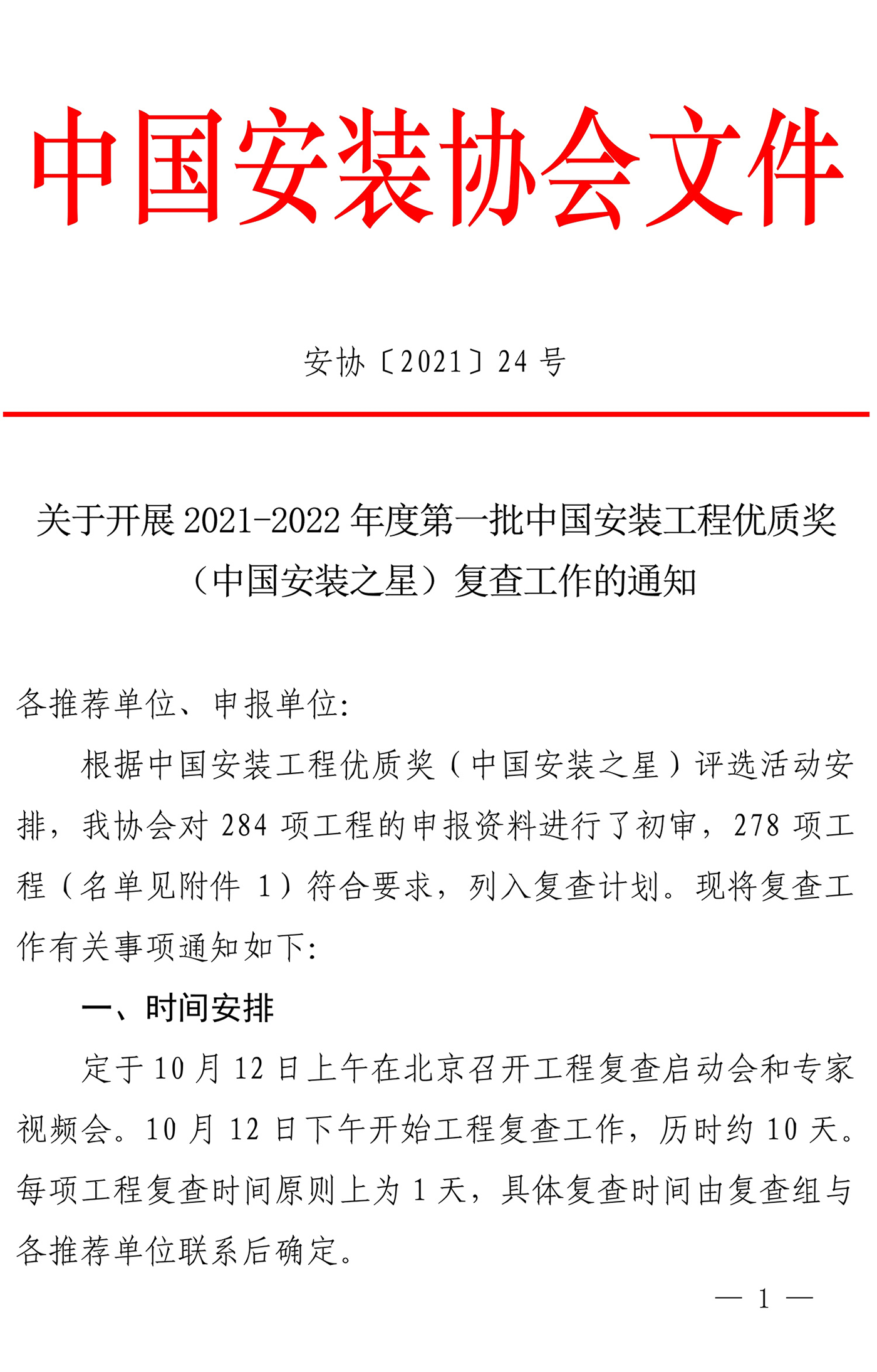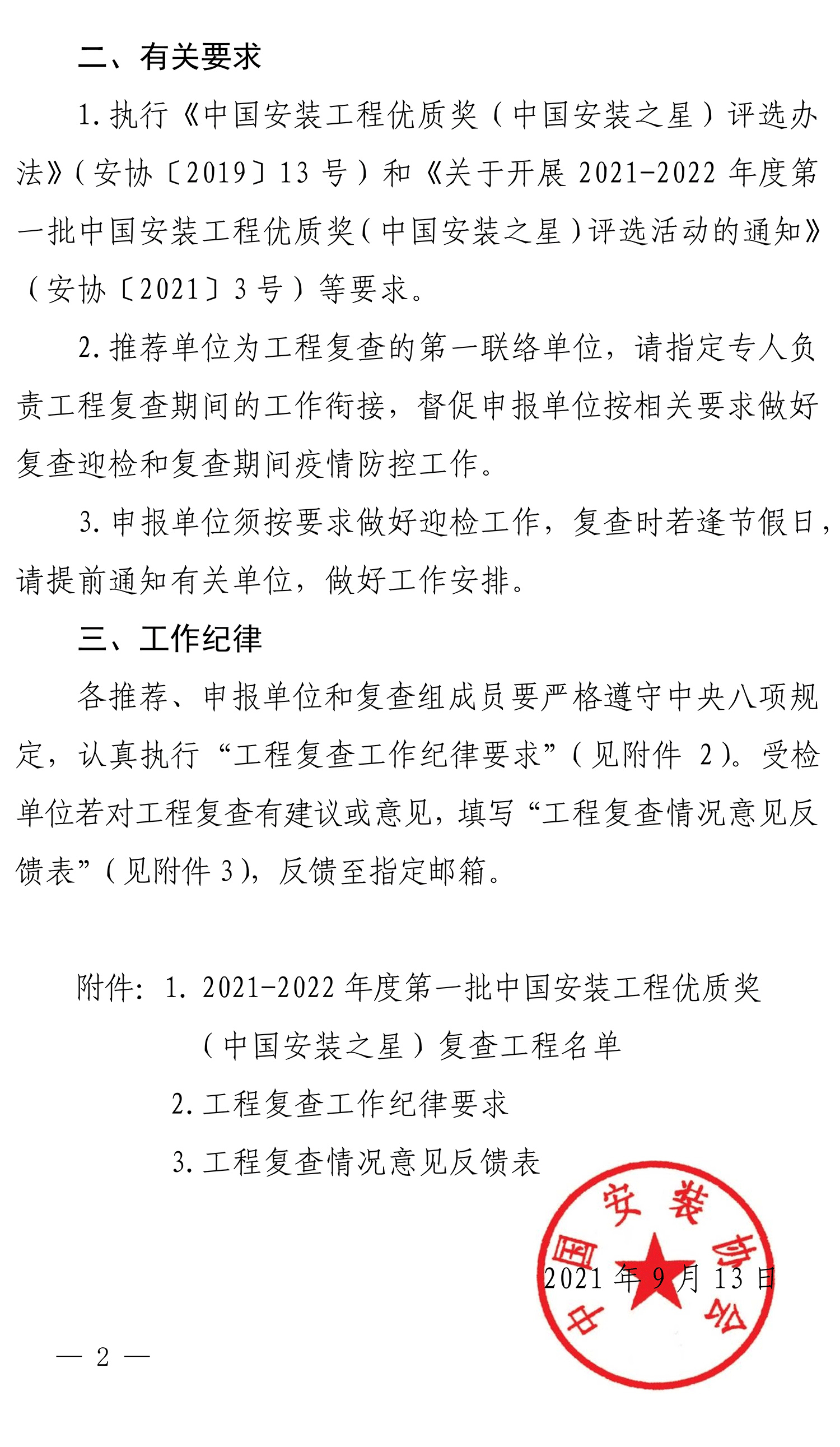 關于開展 2021-2022 年度第一批中國安裝工程優質獎(中國安裝之星)復查工作的通知