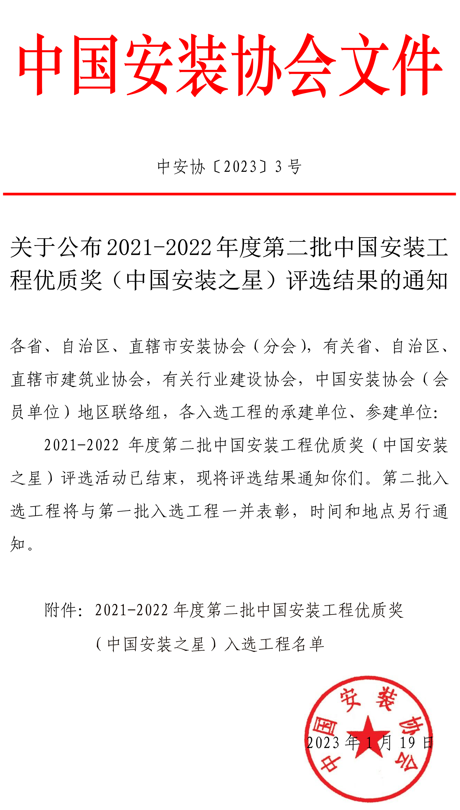 關(guān)于公布2021-2022年度第二批中國(guó)安裝工程優(yōu)質(zhì)獎(jiǎng)(中國(guó)安裝之星)評(píng)選結(jié)果的通知